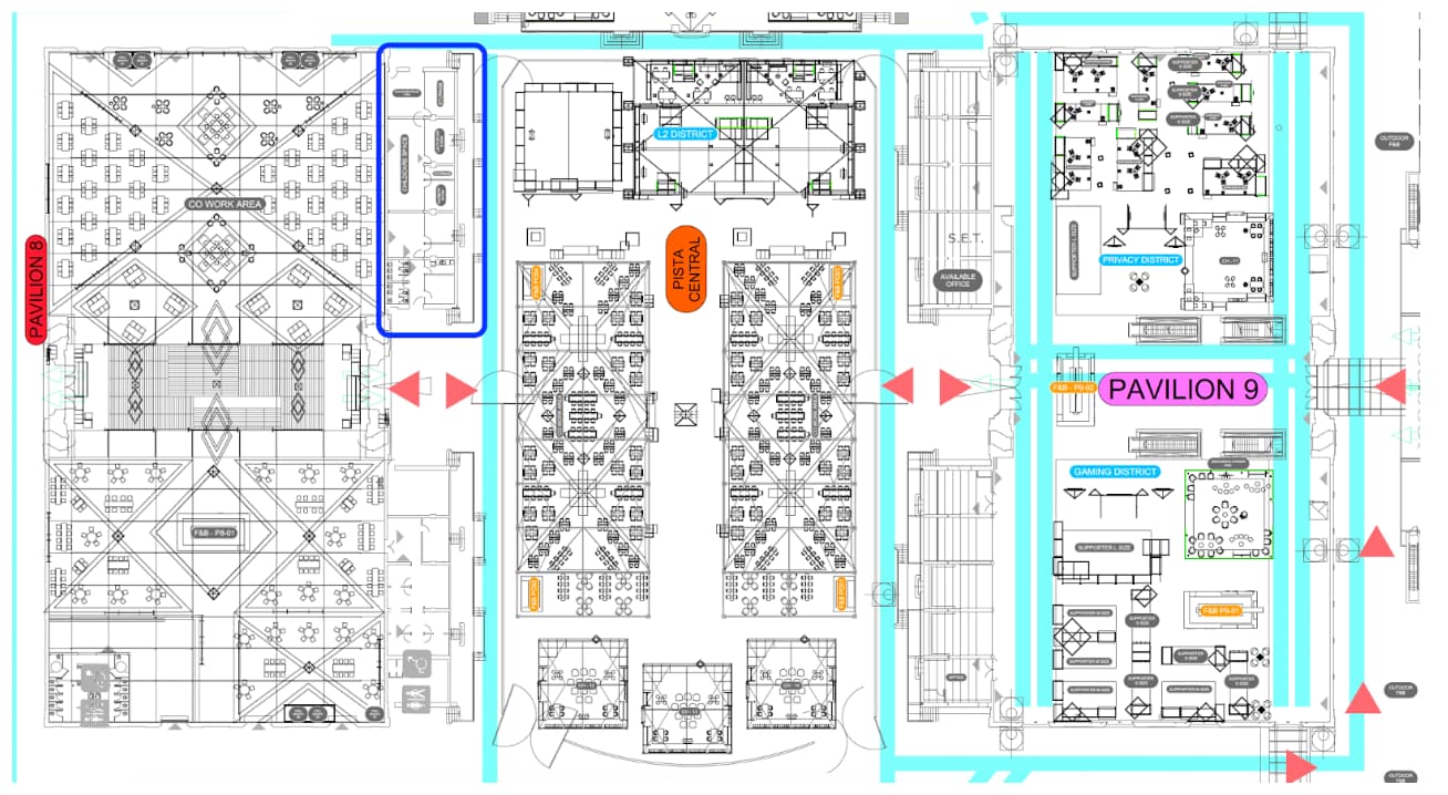 The childcare service will take place in the ground floor offices of Pavilion 8, located right next to the Pista Central (co-working space, heart of the venue). This location offers several advantages in terms of safety, accessibility, and functionality: