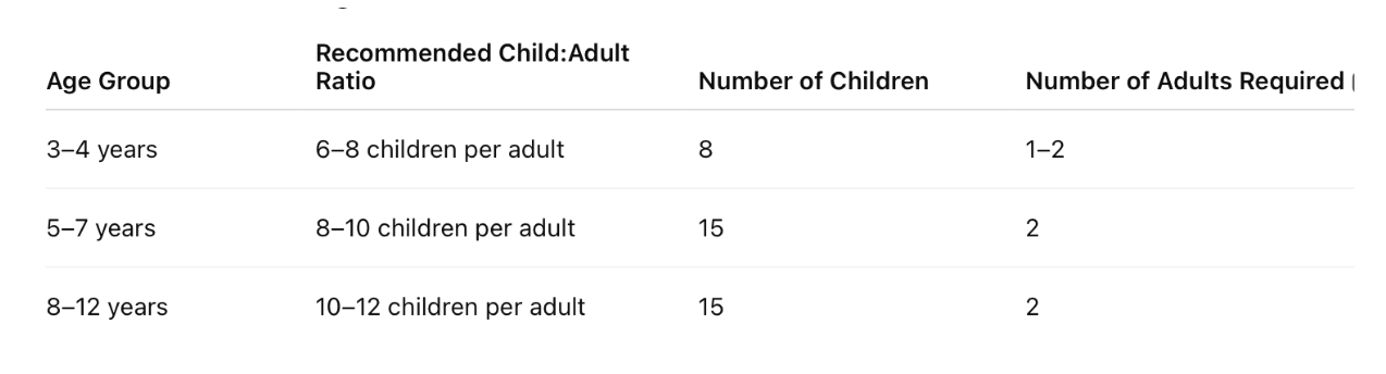 Staffing & Ratios: To ensure maximum safety and supervision, the childcare service will follow recommended child-to-adult ratios based on age: